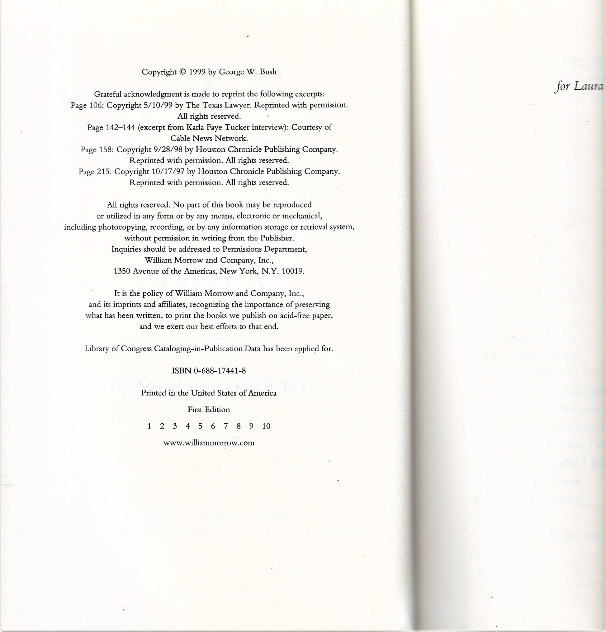 In this political memoir, the governor of Texas and front-runner for president in the year 2000 tells us who he is and what he stands for. The George W. Bush who leaps off these pages has his father's energy, his mother's tart and honest wit, and his own irreverence and impatience. He has prospered as George and Barbara's boy -- "How can I deny it?" -- but has walked a very fine line between loyalty and independence.