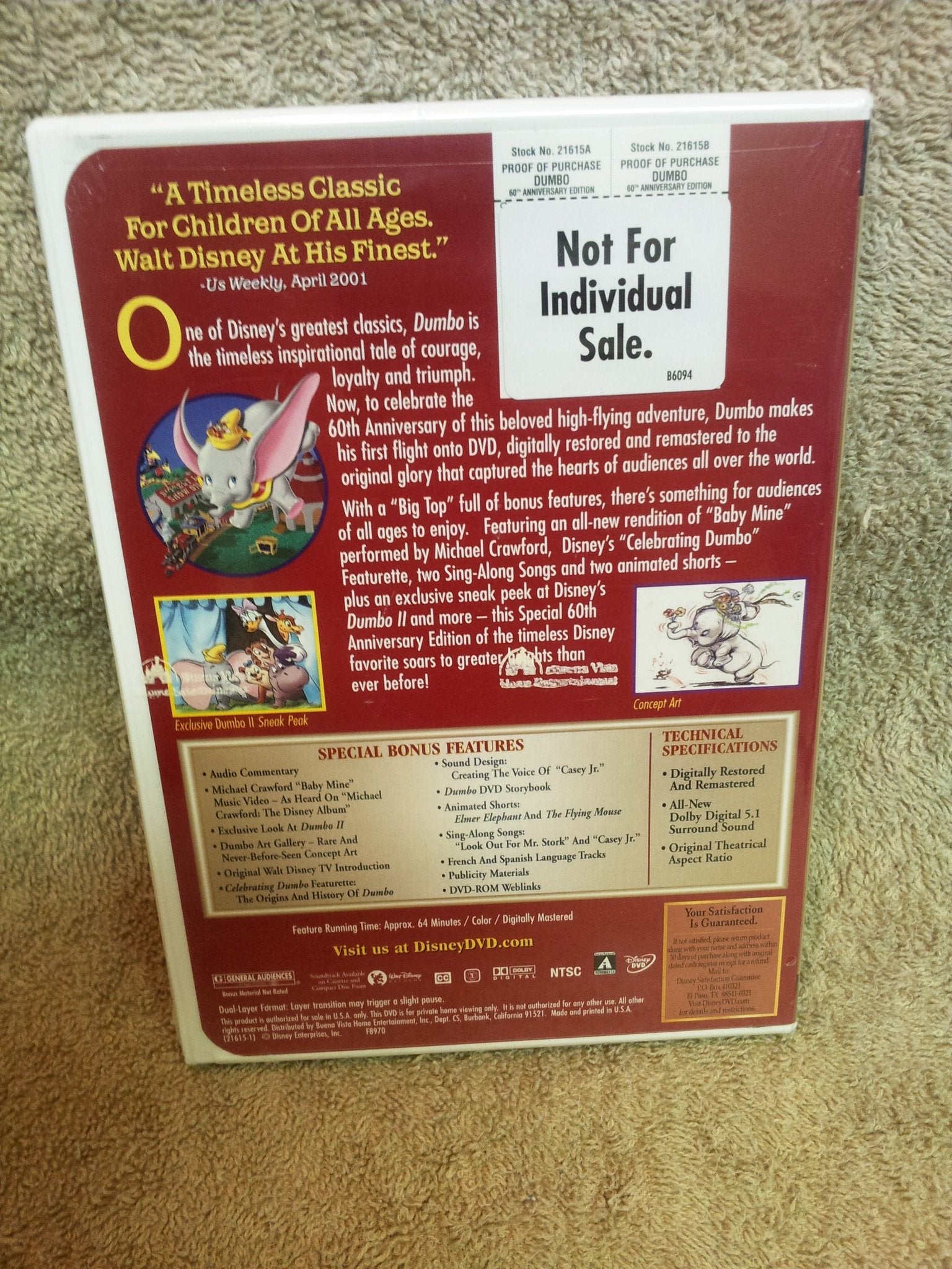 The Dumbo 60th Anniversary Edition was the beneficiary of an electronic film restoration process where every frame of film was scanned into a high resolution computer system, then painstakingly examined and repaired frame by frame to eliminate negative and positive dirt, film scratches and the like. A high definition transfer was done and color correction was supervised by Disney Feature Animation to ensure faithful reproduction of the colors as they were originally intended.